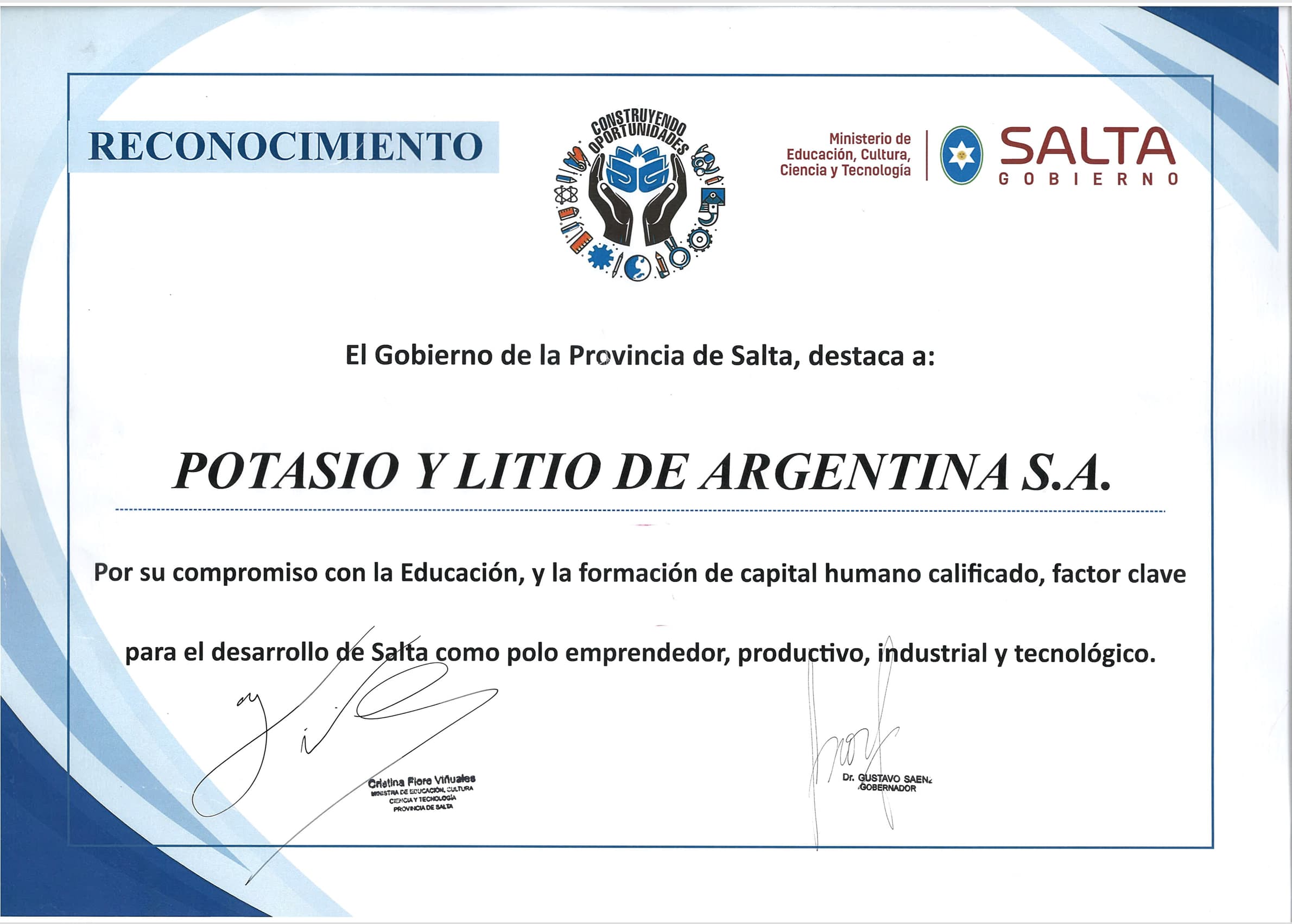 薩爾塔省政府表彰證書